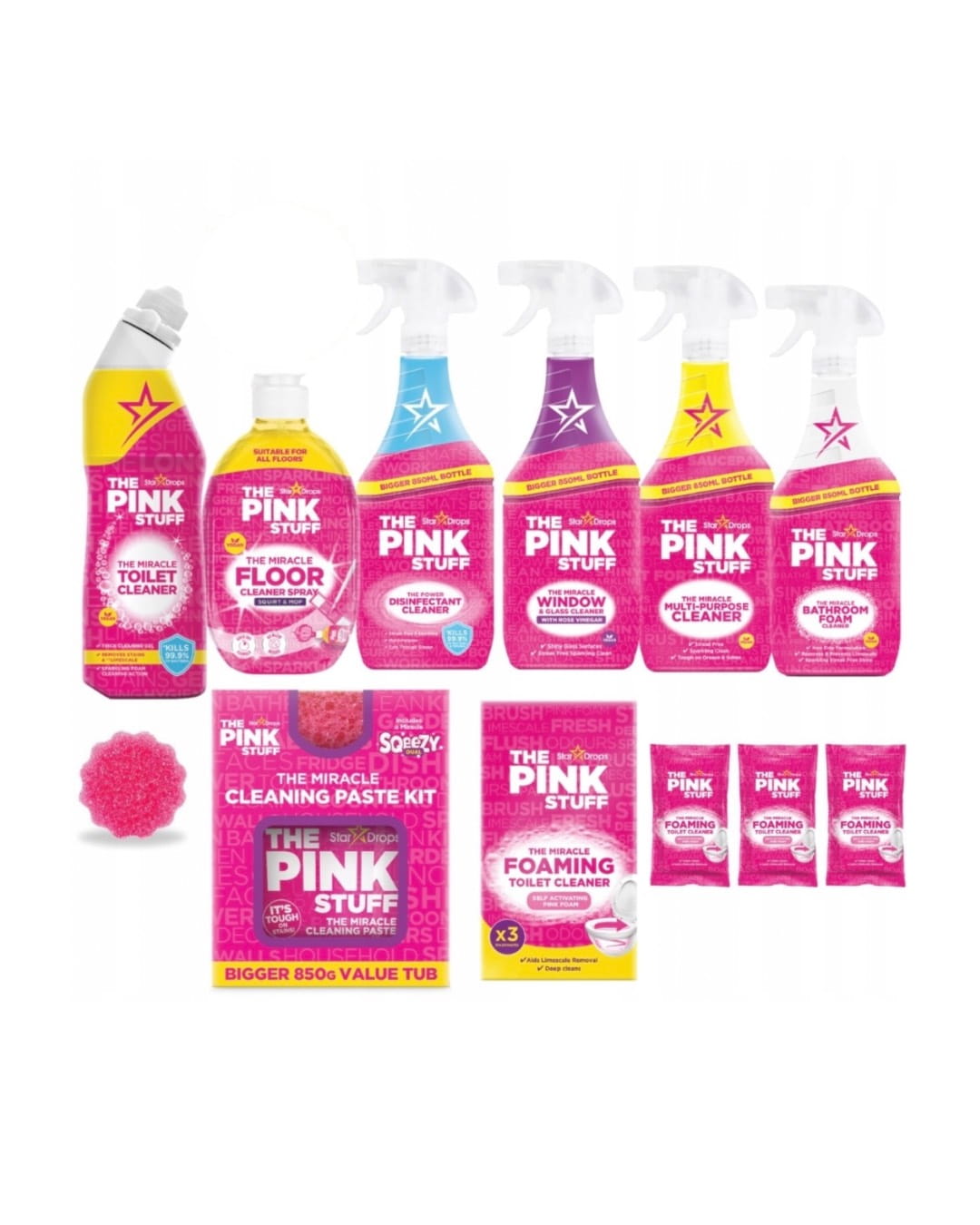 Limitowany zestaw The Pink Stuff – 8 kultowych środków czyszczących do całego domu! Zawiera bestsellerową różową pastę z gąbką, żel i aktywną pianę do WC, piankę do łazienki, uniwersalny spray, płyn do szyb z octem różanym, spray dezynfekujący oraz płyn do podłóg z rabarbarem. Skuteczność, świeży zapach i różowa rewolucja w sprzątaniu!
